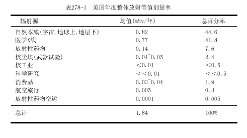 常用的測量單位是倫琴,戈瑞(Gy)和希沃特(Sv).倫琴(R)是空氣中x或γ電離輻射的計(jì)量單位,戈瑞是被各組織或物質(zhì)吸收的能量計(jì)量單位,它可應(yīng)用于各類輻射.R和厘戈瑞(cGy)基本上是相等的.在說明生物學(xué)效應(yīng)時(shí),Sv與經(jīng)質(zhì)量因子校正的Gy相等.因?yàn)閷σ欢康哪芰慷?不同類型的輻射可產(chǎn)生不同的生物學(xué)效應(yīng);例如,中子有較大的效應(yīng).對X和γ輻射,Sv與Gy相等.在現(xiàn)代術(shù)語中Gy和Sv已替代拉德(rad)和雷姆(rem),Gy=100rad,Sv=100rem.在非專業(yè)刊物中常常將輻射分為低水平輻射(0.2~0.3Gy)和高水平輻射(>0.3Gy).而醫(yī)學(xué)劑量一般為<0.05Gy,而且常常<0.01Gy.地球及其大氣的本底放射活性水平很低,而不能測知其效應(yīng)(表278-1).